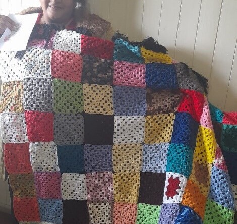 Com as mãos das beneficiárias da oficina de Tricô e crochê através de doação de lãs e linhas foi confeccionado uma colcha de retalhos o qual foi entregue a beneficiária. Luciana tem deficiência visual e participa do Ceava em parceria com o Grupo Adeviva.